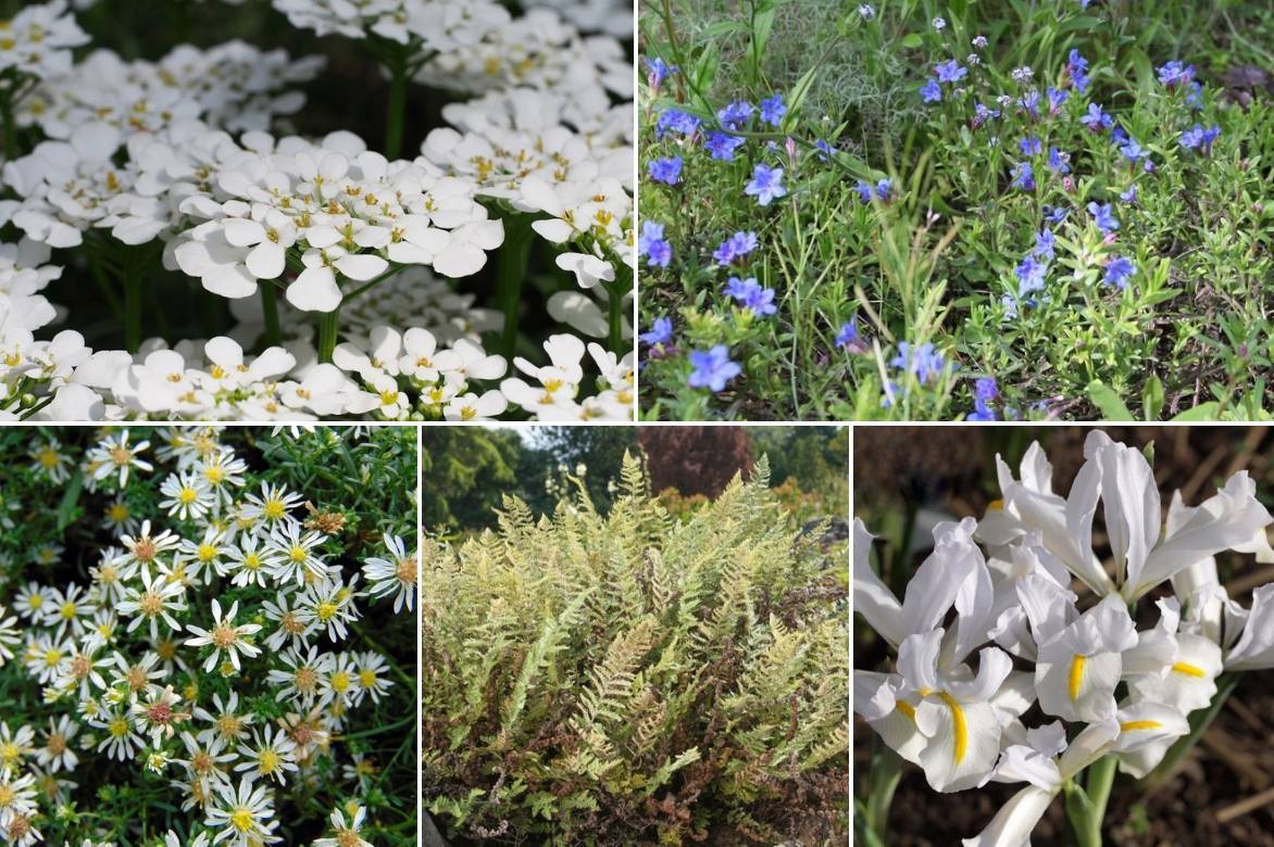 Une idée d’association sur un talus ensoleillé ou une rocaille : Iberis sempervirens ‘Masterpeace’, Lithodora diffusa ‘Heavenly Blue’, Aster ericoïdes f. prostratus ‘Snow Flurry’, Cheilanthes lanosa (©Horticolor) et Iris reticulata ‘White Caucasus’