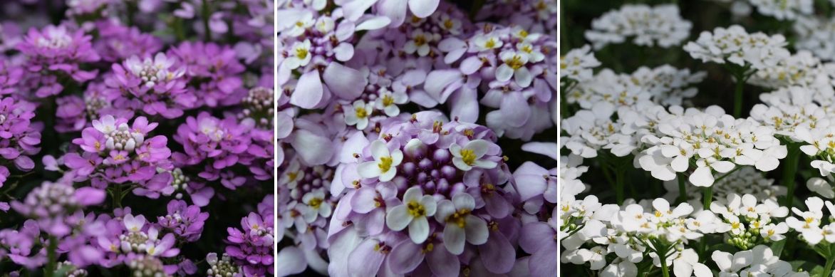 La floraison printanière des corbeilles d’argent : Iberis ‘Absolutely Amethyst’, Iberis sempervirens ‘Pink Ice’, Iberis sempervirens ‘Masterpiece’