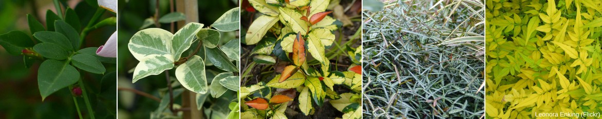 Plusieurs feuillages dont certains sont très décoratifs : Jasminum grandiflorum, Trachelospermum jasminoides ‘Variegatum’, Trachelospermum asiaticum ‘Ogon Nishiki’, Trachelospermum asiaticum ‘Theta’, Jasminum officinale ‘Aureum’.