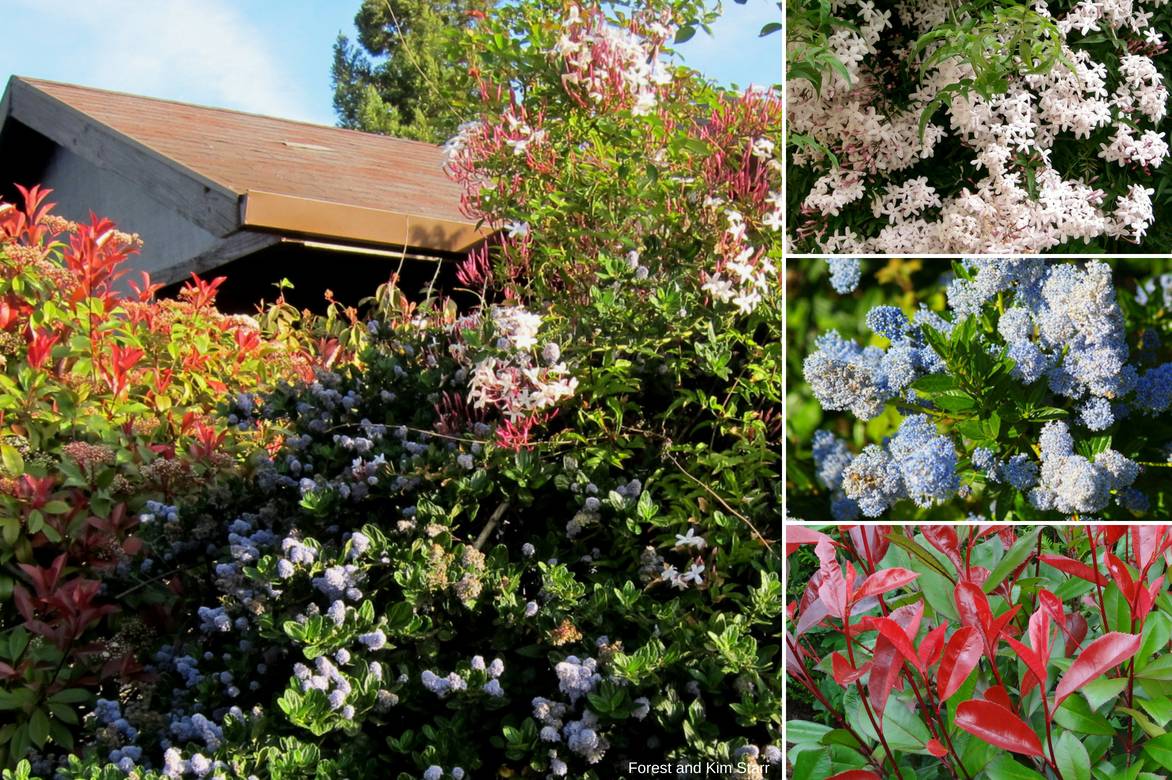 Un exemple d’association en haie persistante : Jasminum polyanthum, Ceanothus arboreus ‘Concha’, Photinia fraseri ‘Red Robin’.