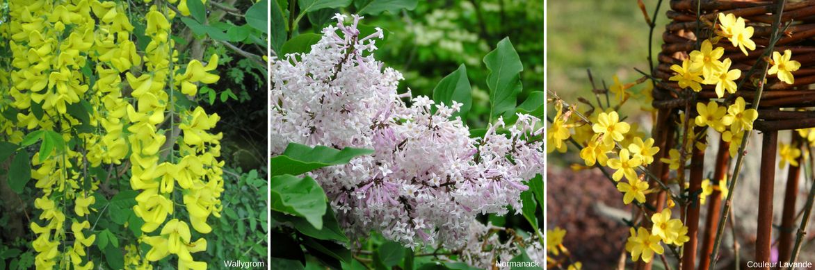 Un exemple d’association : Laburnum watereri ‘Vossii’, Syringa patula ‘Miss Kim’, Jasminum nudiflorum.