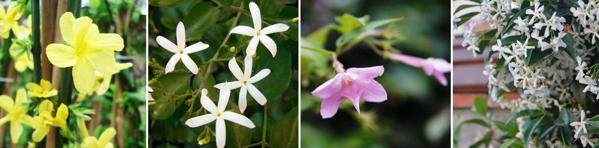 Plusieurs couleurs de fleurs : Jasminum nudiflorum, Jasminum officinale, Jasminum stephanense, Trachelospermum jasminoides.