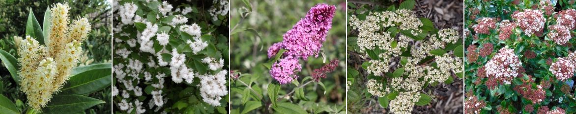 Un exemple d’assocation en haie libre : Prunus laurocerasus ‘Otto Luyken’, Deutzia crenata ‘Pride of Rochester’, Buddleia davidii ‘Pink Delight’, Cotoneaster lacteus, Viburnum tinus