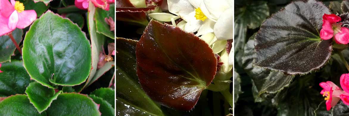 Le feuillage des bégonias peut être vert (Begonia semperflorens ‘Olympia Pink’), bronze (Begonia semperflorens ‘Eureka Bronze Leaf White’, photo David J. Stang) , et parfois presque noir (photo Mariiapulido)