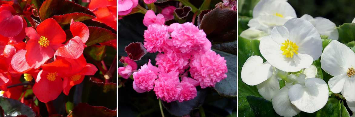 Souvent appelés « bégonias annuels », les bégonias à massif sont des plantes vivaces mais non rustiques et qu’il faut rentrer l’hiver. Il s’agit des Begonia semperflorens : ce sont des plantes qui fleurissent longtemps, du printemps à l’automne, dans des tons blanc, rouge ou rose ! Suivant les variétés, la floraison est simple ou double (en pompons !). Et ils offrent un feuillage décoratif, arrondi et charnu, luisant, qui peut être vert, bronze ou pourpre.