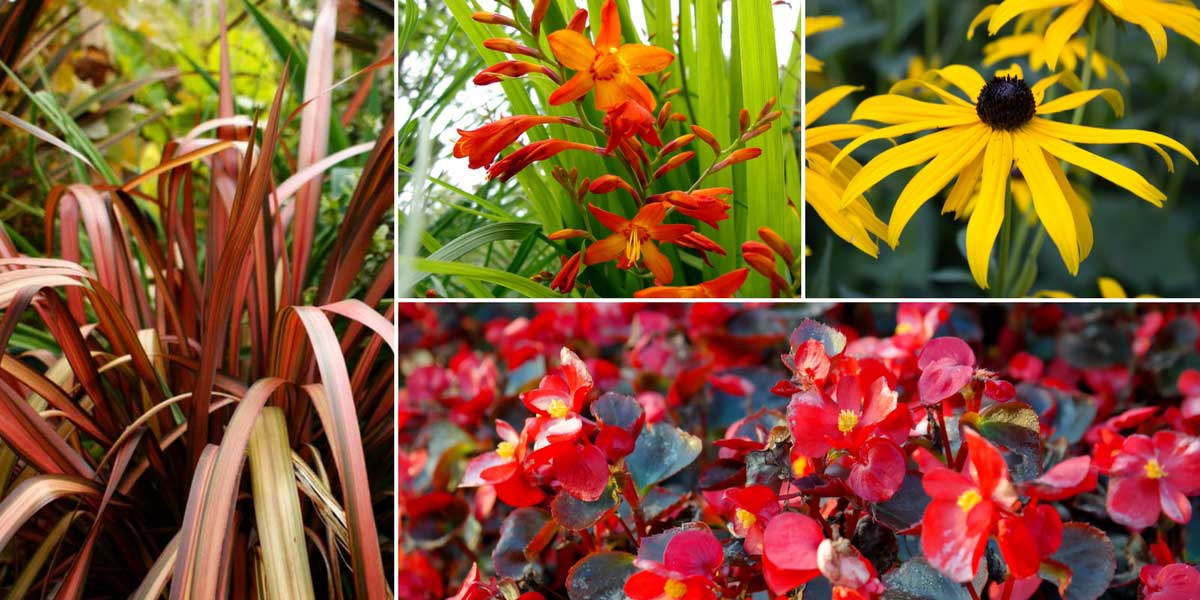 Une idée d’association pour un massif coloré : Phormium ‘Pink Panther’, Crocosmia, Rudbeckia hirta et Begonia semperflorens