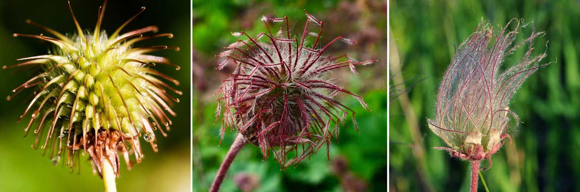 Les fruits et akènes des Benoites : ceux de Geum urbanum, munis de crochets / Geum rivale (photo H. Zell) / Geum triflorum (photo Aaron Carlson)