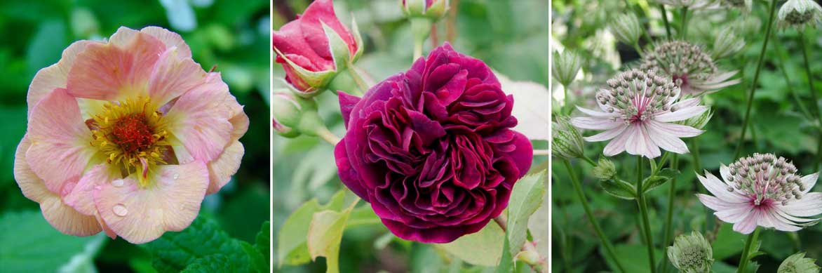 Vous pouvez planter les benoites au pied des rosiers, en compagnie d’autres floraisons délicates, comme les astrances ! Geum ‘Mai Tai’, Rosa ‘Munstead Wood’ et Astrantia major ‘Rosea’