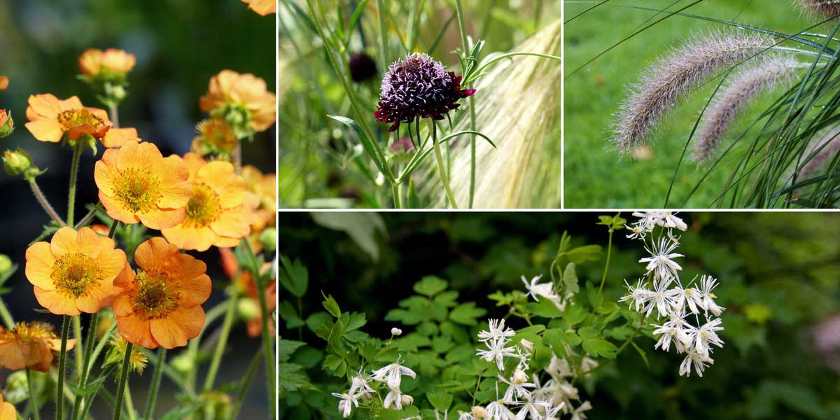 Associez les Geum à d’autres floraisons légères ! Geum ‘Totally Tangerine’, Scabiosa atropurpurea ‘Chile Black’, Pennisetum alopecuroides (photo Dominicus Johannes Bergsma) et Thalictrum aquilegifolium