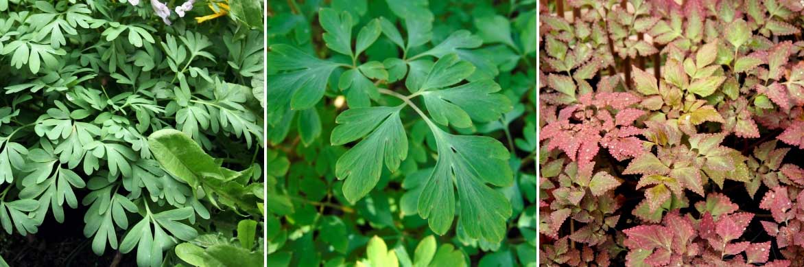 Le feuillage des corydales, léger et finement divisé. Corydalis solida (Bjoertvedt), Corydalis ‘Blackberry Wine’ et Corydalis quantmeyeriana ‘Chocolate Stars’