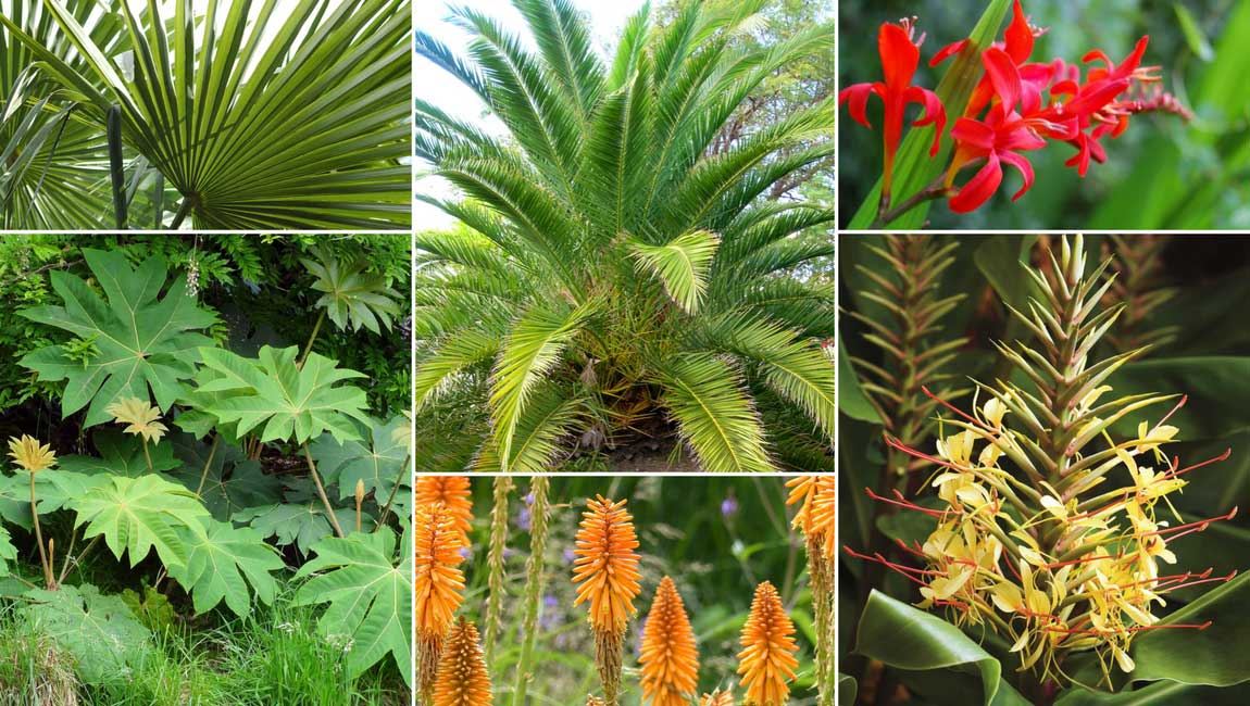 Profitez des palmiers pour créer une ambiance exotique ! Trachycarpus fortunei (photo Vera Buhl), Phoenix canariensis (photo Forest & Kim Starr), Crocosmia ‘Lucifer’ (photo Vicky Brock), Tetrapanax papyrifera ‘Rex’, Kniphofia ‘Fiery Fred’ et Hedychium gardnerianum (photo J.J. Harrison)