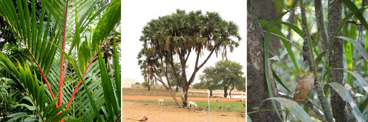 Les palmiers forment un grand groupe, dont certains individus se distinguent par leur originalité. Le stipe rouge vif du Cyrtostachys renda (Krzysztof Ziarnek, Kenraiz), le stipe ramifié de l’Hyphaene thebaica (photo Malcolm Manners), et le palmier grimpant Calamus thwaitesii (photo Dinesh Valke)