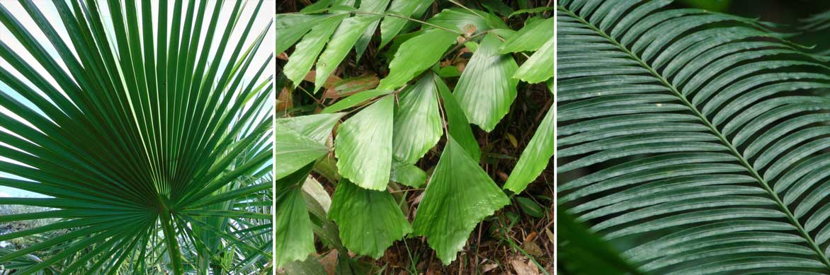 Les feuilles palmées du Washingtonia robusta, le feuillage original en “queue de poisson” du Caryota mitis (photo Mokkie), et les feuilles pennées d’un Phoenix (photo Wiethase Hendrik)