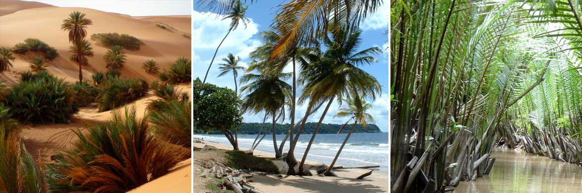 A l’état sauvage, les palmiers poussent dans des milieux variés. On trouve le palmier-dattier (Phoenix dactylifera) dans les régions désertiques (photo Franzfoto), le cocotier (Cocos nucifera) sur les plages en bord de mer (photo Kalamazadkhan), tandis que Nypa fruticans pousse dans les mangroves (photo Luis Argerich)