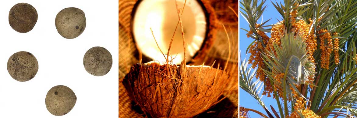Les graines du Butia capitata (photo Roger Culos – Museum de Toulouse), une Noix de coco (photo Nicolai Schäfer), et les dattes : fruits du palmier Phoenix dactylifera (photo Bernadette Simpson)