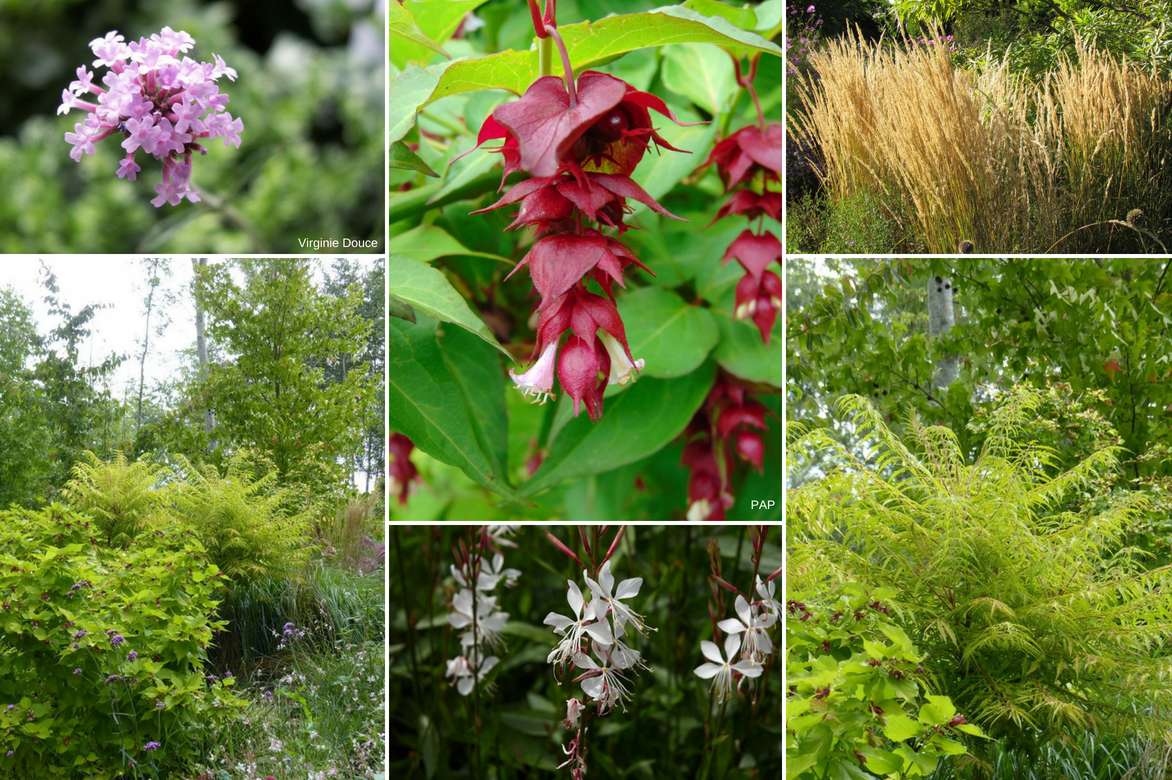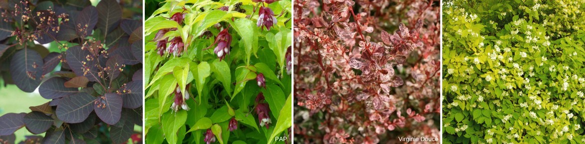 Un exemple d’association : Cotinus coggygria ‘Royal Purple’, Leycesteria formosa ‘Golden Lanterns’, Berberis thunbergii ‘Rosy Glow’, Philadelphus coronarius ‘Aureus’.