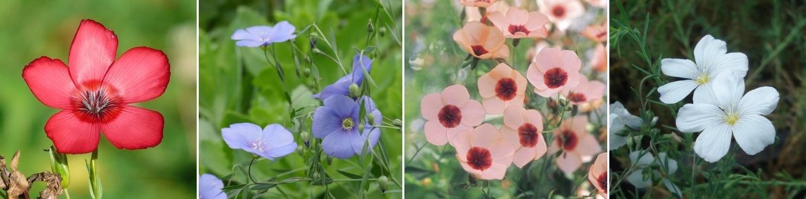 Plusieurs couleurs : Linum grandiflorum, Linum perenne, Linum grandiflorum ‘Charmer Salmon’ et Linum perenne ‘Diamant’