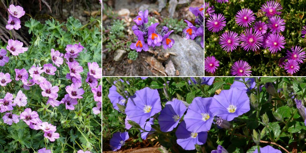 Les petites variétés de linaires s’intègrent facilement dans les rocailles ! Geranium cinereum ‘Lawrence Flatman’, Linaria alpina (photo Muriel Bendel), Delosperma cooperi (photo Alexander Klink), et Convolvulus mauritanicus (photo Stan Shebs)