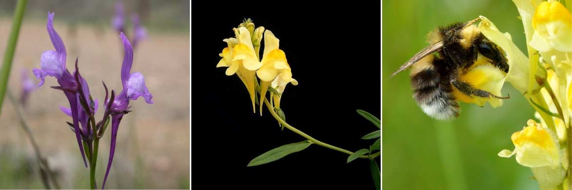 La floraison des linaires : Linaria pelisseriana (photo Donald Hobern) / Linaria vulgaris (photo Frank Vincentz) / Un bourdon pollinisant une fleur de Linaria vulgaris (photo Ivar Leidus)