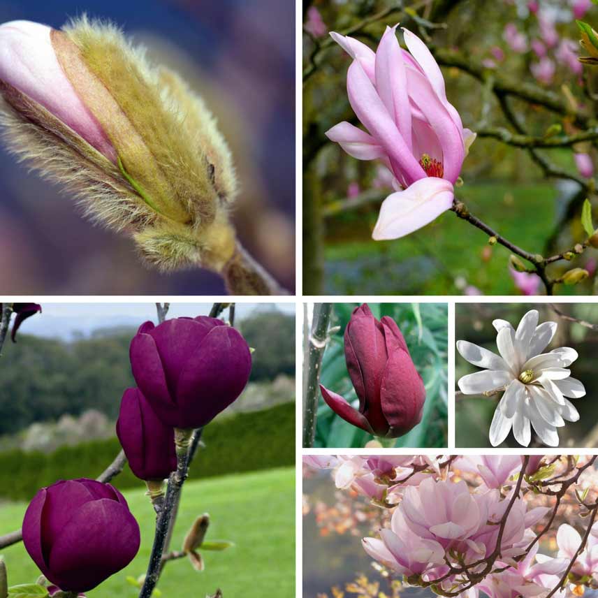 En haut: Magnolia soulangeana En bas, de gauche à droite: Magnolia ‘Black Tulip’ – Magnolia ‘Genie’ -Magnolia stellata- Magnolia ‘Heaven Scent’