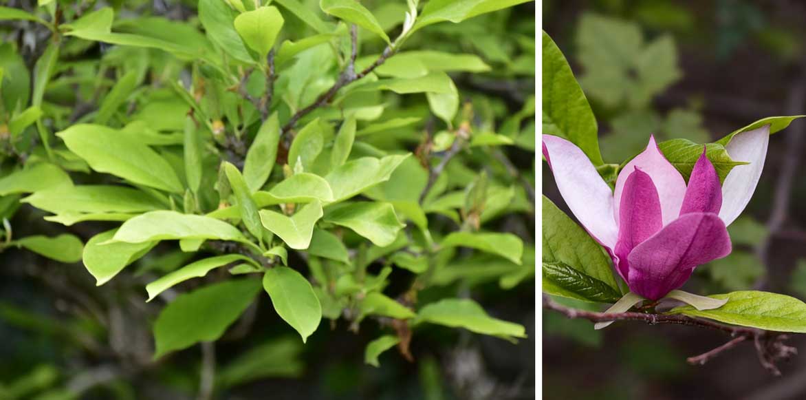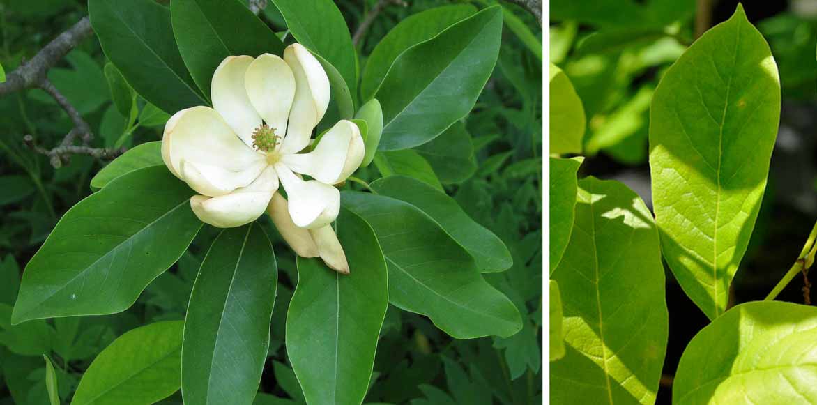 Le feuillage original, vert sur le dessus, argenté dessous du Magnolia virginiana Glauca et les feuilles coriaces du Magnolia stellata