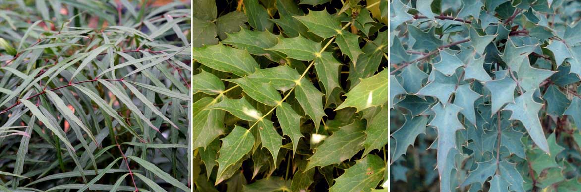 Le feuillage des mahonias prend des formes variées : de gauche à droite, Mahonia ‘Soft Caress’, Mahonia aquifolium (photo Krzysztof Golik) et Mahonia fremontii (photo Genet)