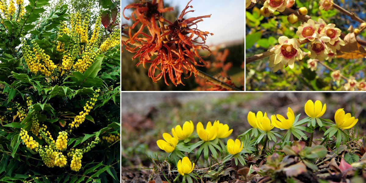 Associez le mahonia à d’autres floraisons hivernales ! Mahonia x media ‘Charity’, Hamamelis ‘Jelena’ (photo Meneerke bloem), Chimonanthus praecox (photo Kristine Paulus) et Eranthis hyemalis