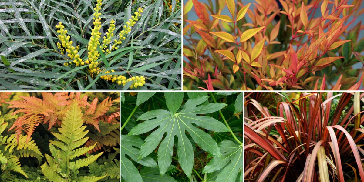 Profitez du mahonia pour composer une scène exotique ! Mahonia ‘Soft Caress’, Nandina domestica ‘Gulf Stream’, Dryopteris erythrosora, Fatsia japonica (photo Dbxsoul) et Phormium ‘Pink Panther’