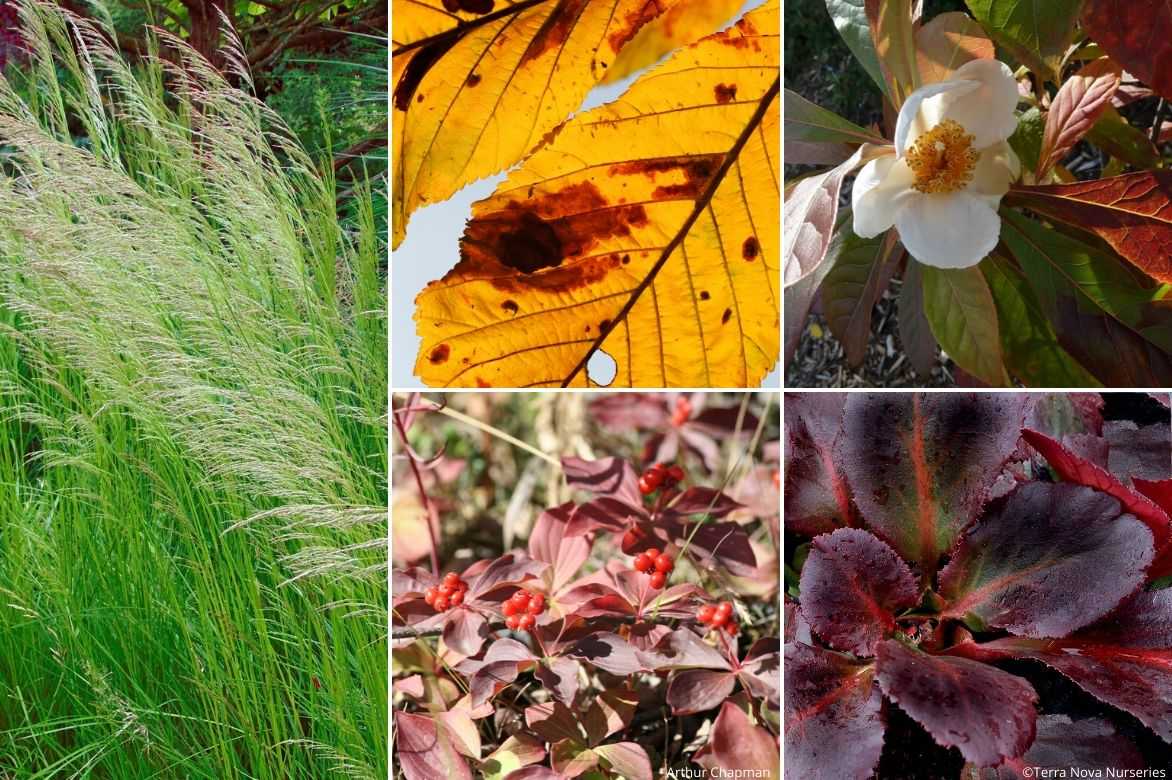 Un exemple d’association automnale : Deschampsia cespitosa ‘Goldschleier’, Aesculus pavia ‘Koehnei’, Franklinia alatamaha, Cornus canadensis et Bergenia ‘Dragonfly Sakura’ (ou encore ‘Eden’s Dark Margin’)
