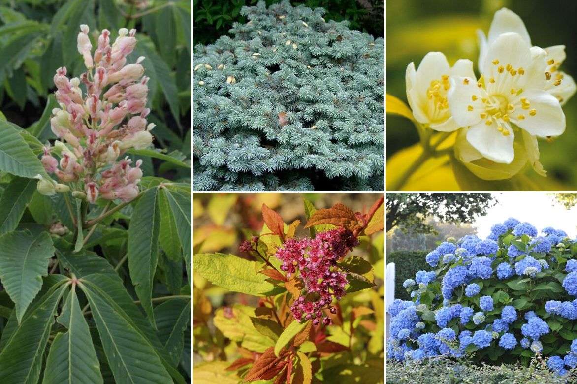 Mais les Aesculus sont aussi plantés pour leur floraison spectaculaire comme ce petit arbre à croissance lente qu’est l’Aesculus neglecta ‘Autumn Fire’. Son nom, vous l’aurez compris, lui vient de son feuillage automnal orange feu mais il est tellement beau aussi au printemps lorsque ses jeunes feuilles débourrent dans des tons bronze-cuivrés. S’ensuit rapidement une floraison d’abord jaune pâle puis saumon au fil des jours. C’est véritablement un bijou à isoler… ou pas. Car bien accompagné, il sera encore plus beau ! Quelques arbustes au feuillage de couleur jaune doré répondront parfaitement au jeune feuillage et aux fleurs du marronnier : comme un Cornus alba ‘Aurea‘, un grand classique indémodable et toujours beau de janvier à décembre, ainsi qu’une poignée de Spirée japonaise ‘Magic Carpet’ en bordure. Une touche de bleu sera parfaite pour contraster avec tous ces précédents éléments. Comme notre exclusivité : l’Hydrangea macrophylla ‘The Original’ à fleurs bleues, un hortensia très robuste et très florifère. Un feuillage bleu vous tente ? Est-ce qu’un petit Picea pungens ‘Glauca Globosa‘ pourrait vous ravir ? Ce petit conifère est une merveille au printemps lorsqu’il prend ses teintes bleutées.
