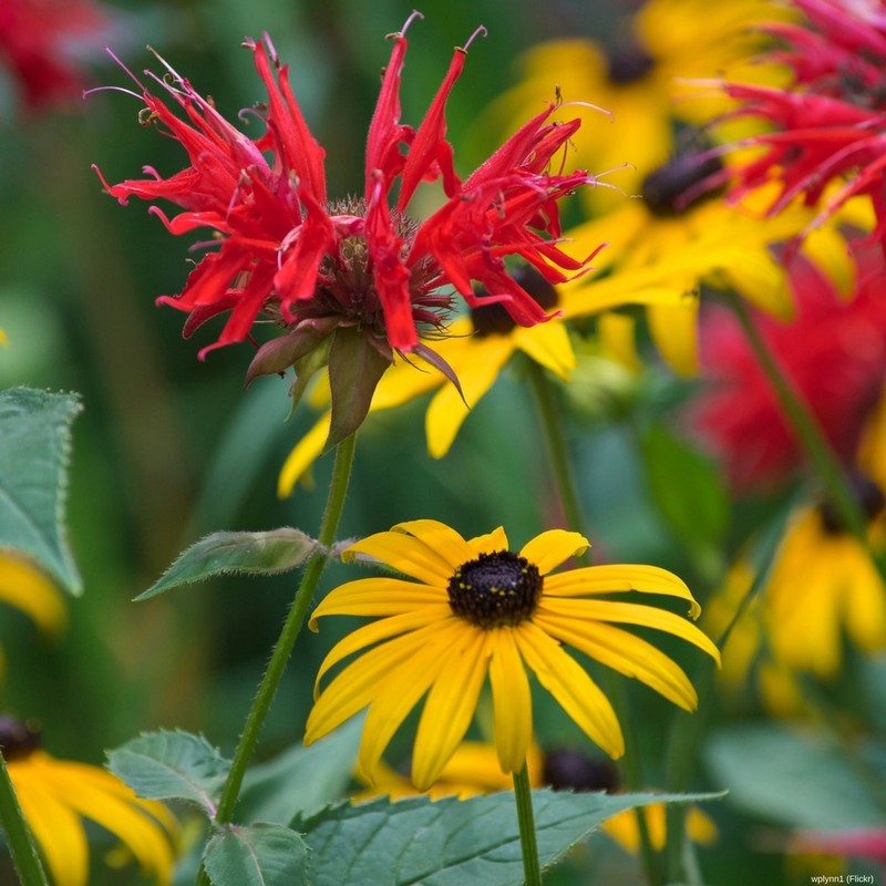 Pour créer un massif éclatant, n’ayez pas peur de jouer sur un contraste de couleurs et de formes en mêlant une monarde à fleurs rouges, comme la monarde ‘Gardenview Scarlet’, à d’autres vivaces de couleur jaune et orange comme les rudbeckias ou les hélianthus.
