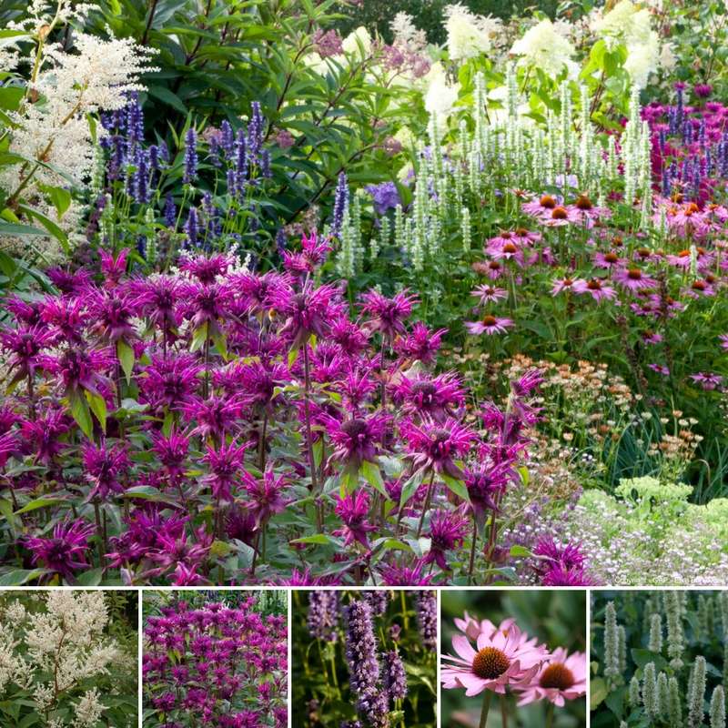 Si vous préférez les ambiances romantiques, misez sur les couleurs pastel en associant le doux rose pâle de la monarde ‘Beauty of Cobham’, au bleu tendre des échinops et au mauve des agapanthes. La Campanula lactiflora ‘Alba’ et ses fleurs laiteuses feront également merveille dans ce décor.