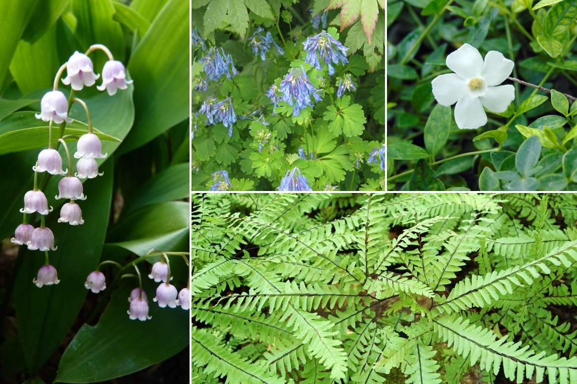 Un autre exemple d’association : Convallaria majalis ‘Rosea’, Corydalis flexuosa ‘Purple Leaf’, Vinca minor ‘Gertrude Jekyll’, Adiantum aleuticum ‘Imbricatum’ (photo InAweofGod’sCreation)