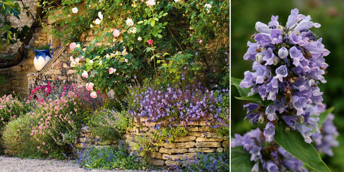 Les népétas peuvent s’intégrer à un jardin sec, ou de style méditerranéen. Rosier ‘Pierre de Ronsard’, Helianthemum ‘Lawrenson’s Pink’, Campanule, Nepeta racemosa ‘Grog’ et Dianthus allwoodii ‘Romeo’ (photo E. Gonnet – Biosphoto) / Nepeta subsessilis (photo Uleli)