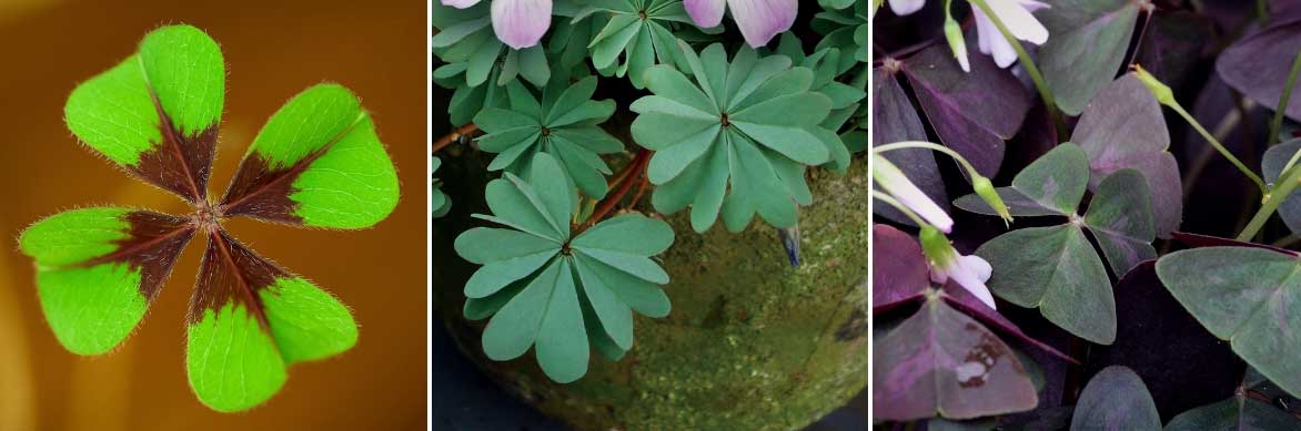 Les feuilles des oxalis ressemblent énormément à celles des trèfles. C’est ce qui vaut à certaines espèces, à quatre folioles, leur succès – profitant de l’idée que les trèfles à quatre feuilles portent chance.