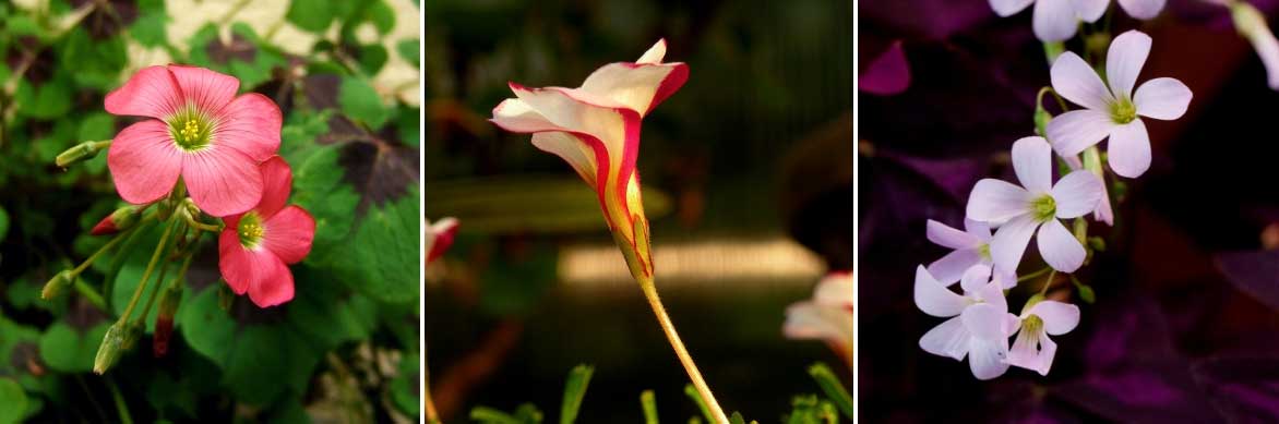 La floraison des Oxalis tetraphylla (photo Wildfeuer), Oxalis versicolor (photo Nzfauna) et Oxalis triangularis ‘Atropurpurea (photo Nekonomania)
