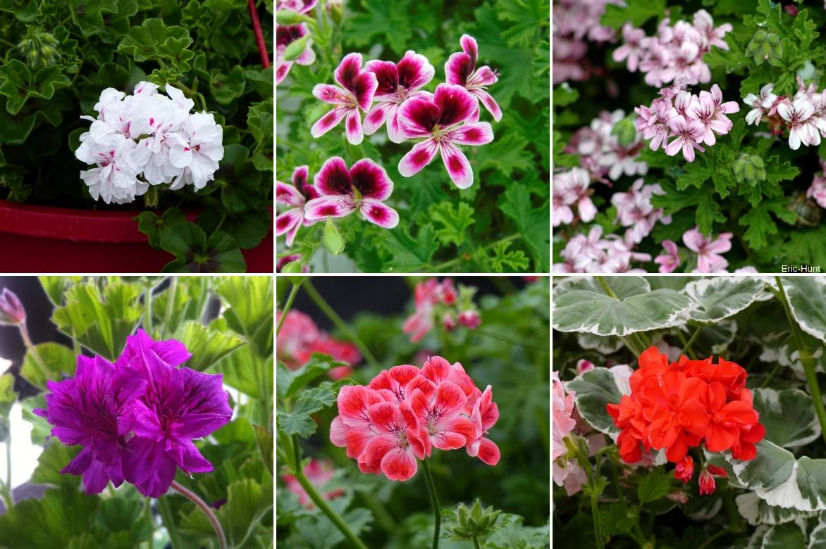 Quelques fleurs : Pelargonium peltatum ‘Big 5 White Angel’, Pelargonium ‘Mosquitaway Eva’, Pelargonium graveolens, Pelargonium cucullatum, Pelargonium ‘Paton’s Unique’ et Pelargonium ‘Wilhelm Langguth’