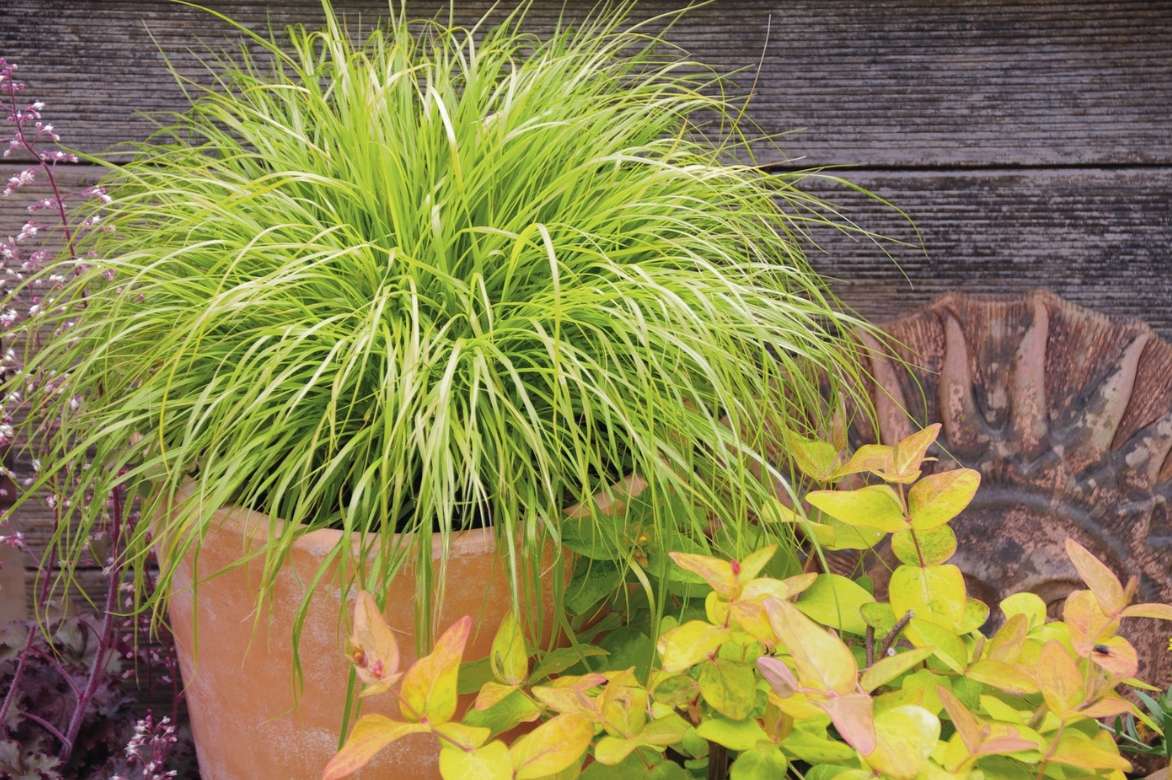 Le Pennisetum se prête bien à la culture en pot. Ici, Le Pennisetum alocuperoides ‘Hameln Gold’ aux feuillage lumineux.