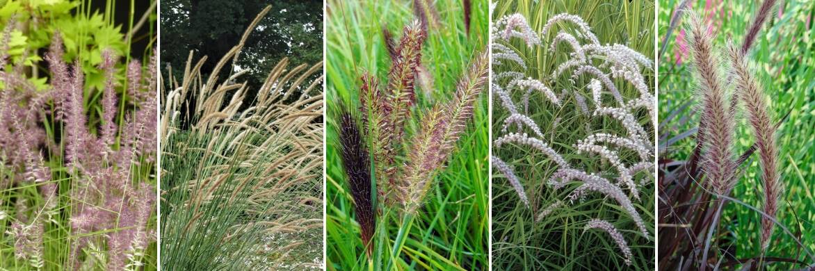 Les pennisetum présentent des inflorescences de formes et de couleurs différentes : Pennisetum alocuperoides ‘Karley Rose’, Pennisetum macourum, Pennisetum alocuperoides ‘Moudry’, Pennisetum orientale ‘Tall Tails’, Pennisetum setaceum ‘Rubrum’.