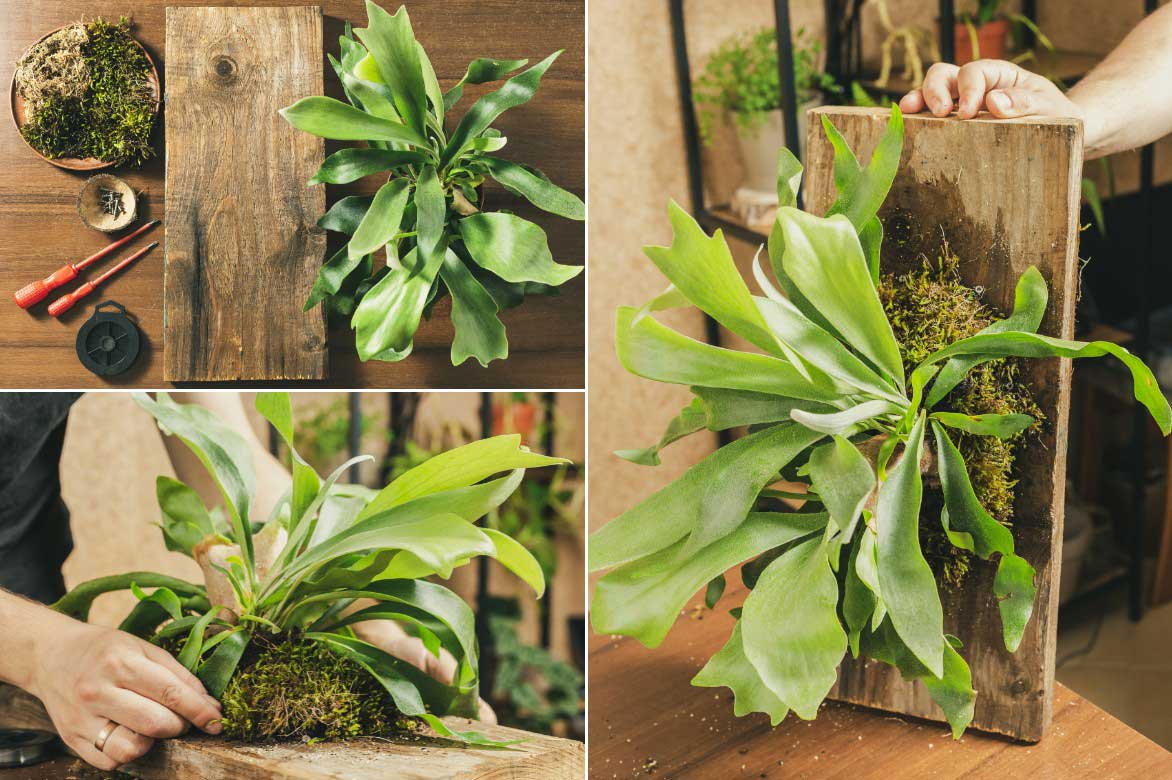 Le Platycerium est très décoratif lorsqu’il est installé sur un support vertical comme une planche en bois. La mousse aide à le fixer et à préserver l’humidité autour de ses racines.