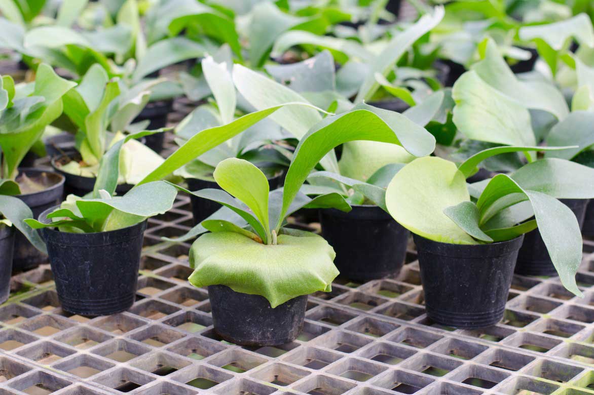 Jeunes plants de Platycerium cultivés en pot. On voit bien que les frondes stériles commencent déjà à recouvrir les pots.