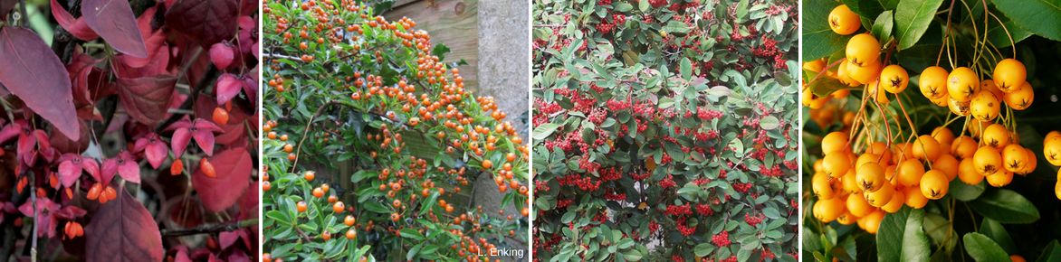 Un exemple d’association en haie : Euonymus planipes, Pyracantha ‘Teton’, Cotoneaster lacteus, Pyracantha ‘Golden Charmer’.