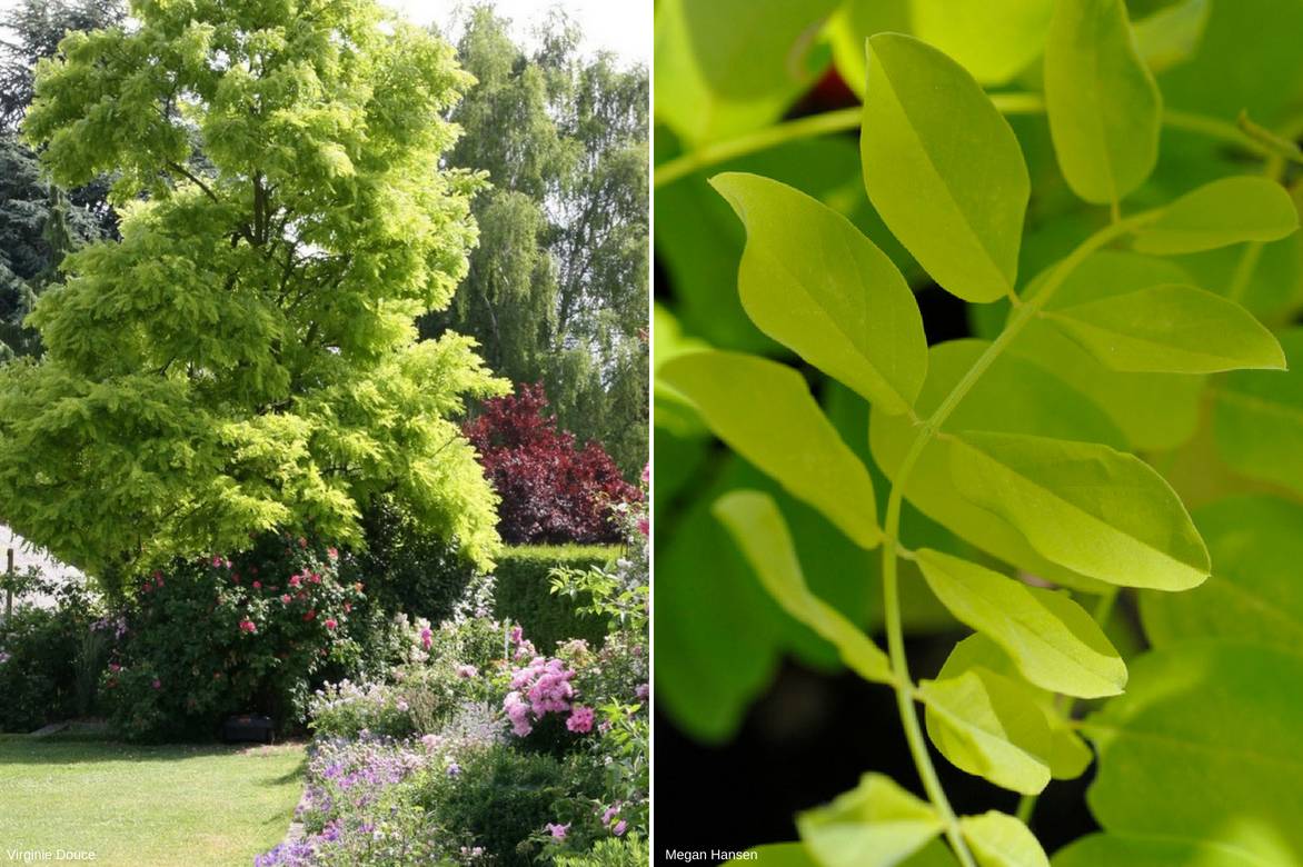 Un exemple d’utilisation : l’Acacia pseudoacacia ‘Frisia’ apporte beaucoup de lumière parmi les roses. Accompagnez les roses de népétas, de géraniums vivaces, de molènes, de pavots, de stachys… pour un esprit champêtre.