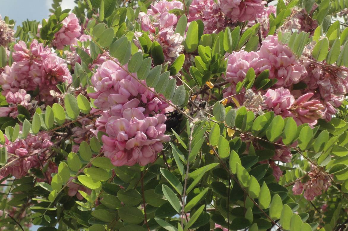 Les fleurs de pois qui composent la grappe d’environ 14 cm de long, sont blanches et odorantes chez le Robinier faux-acacia, rose mât chez R. hispida, rose vif chez Casque Rouge, blanches lavées de rose chez la variété naine Robinia x slavinii ‘Hillieri’. Les grappes de R. viscosa sont assez atypiques par leur coloris rose clair nuancé de jaune pâle qui tranche joliment avec les rameaux presque noirs de l’arbre.