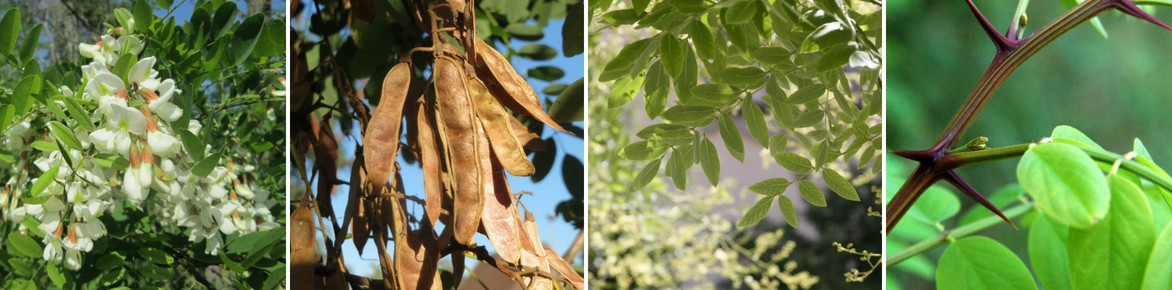Robinia pseudoacacia : grappes de fleurs (Andreas Rockstein), gousses de graines (Andreas Rockstein), feuilles (Virginie Douce), épines (Rudolf Schäfer).