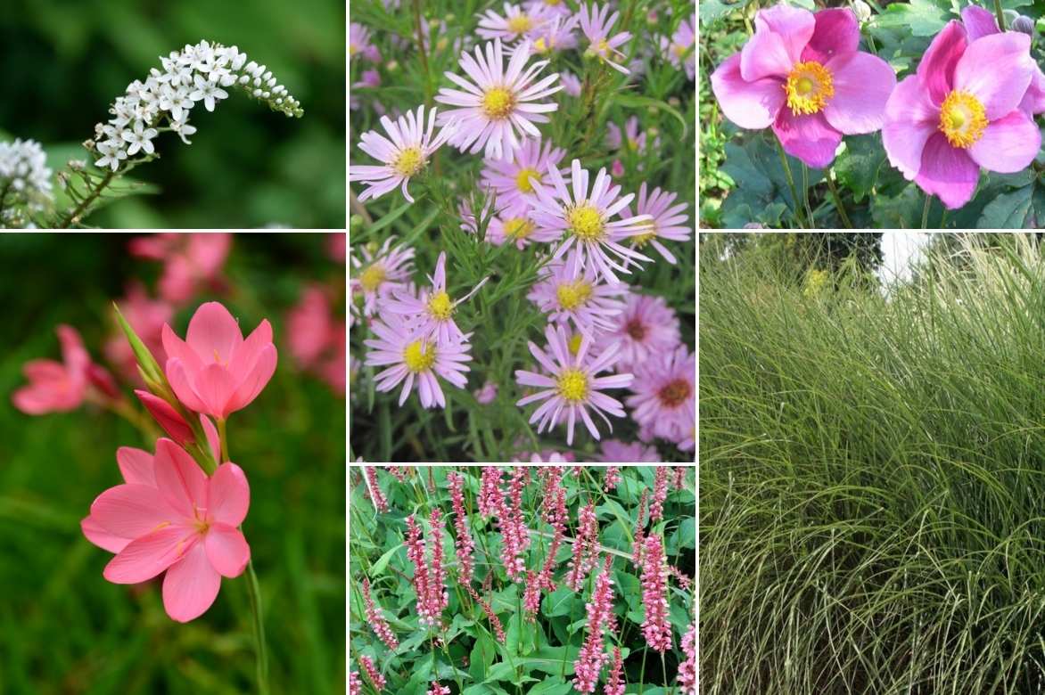 Un exemple de massif à floraison automnale : Schizostylis, Lysimachias clethroides, Asters ‘Pink Star’, Persicaria amplexicaulis ‘Orange Field’, Anémone du Japon hupehensis Splendens, Miscanthus sinensis Gnom