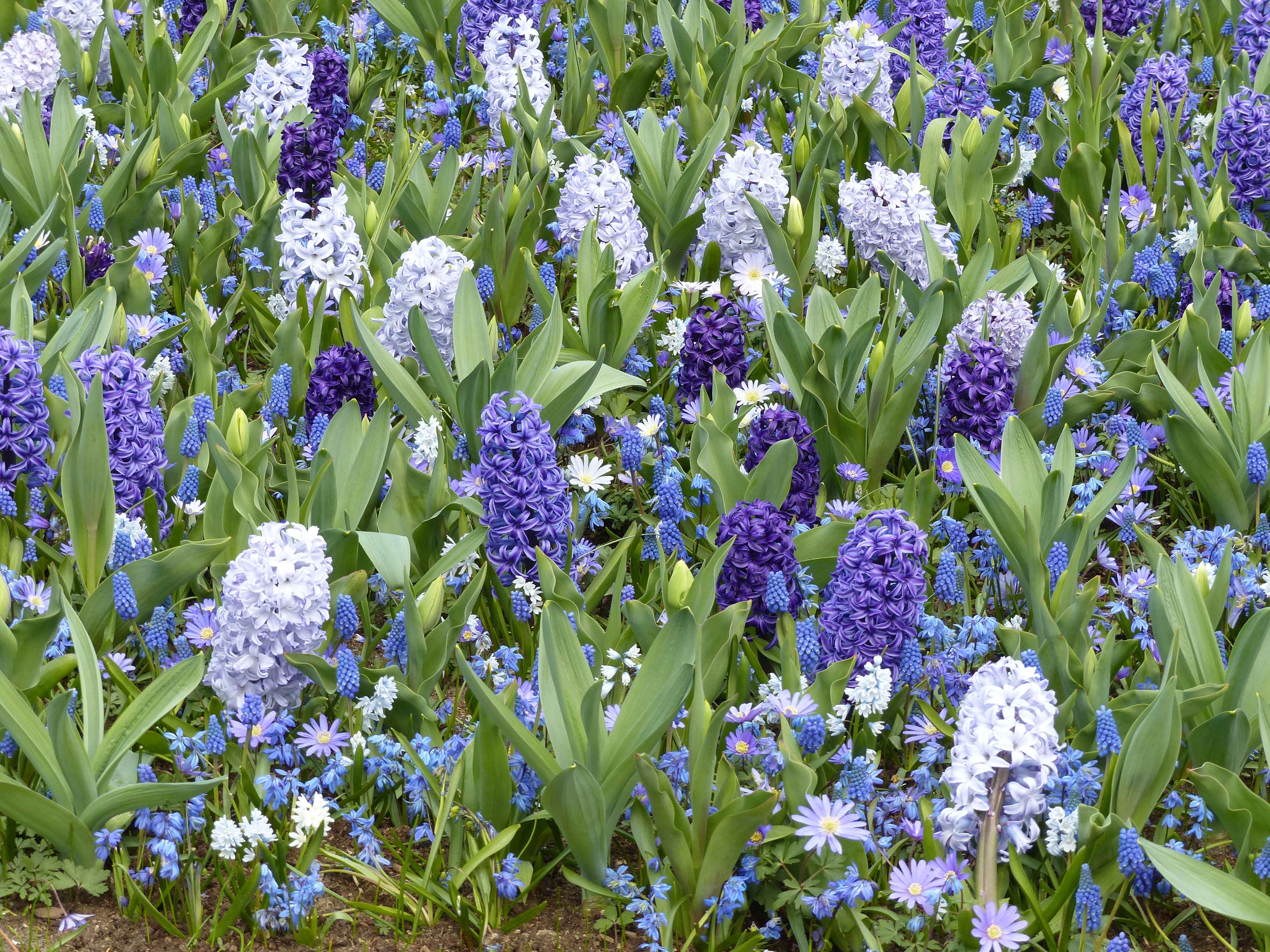 Jacinthe ‘Blue Jacket’, ‘Blue Eyes, Muscari, Scilla et Anemone blanda