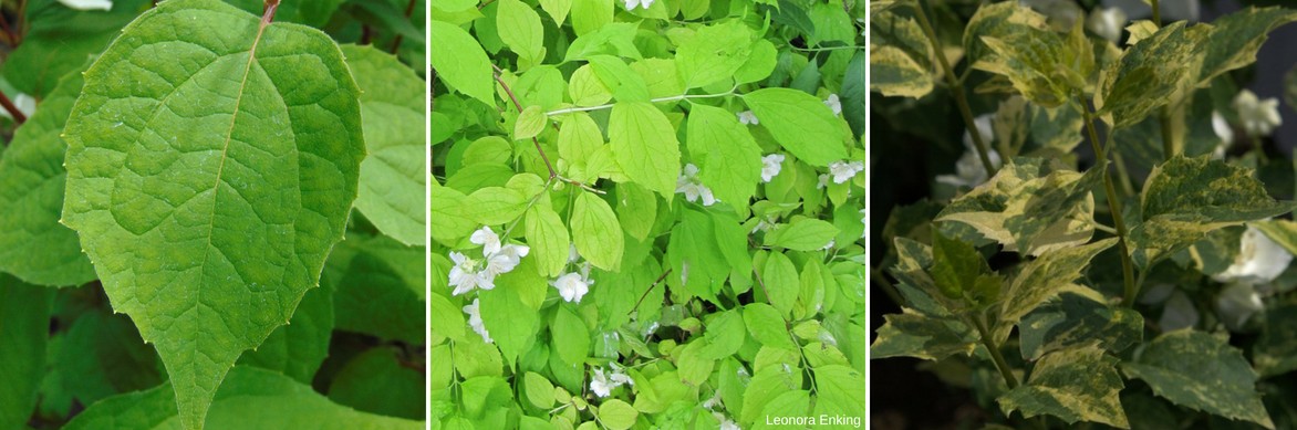 Plusieurs feuillages de seringats : Philadephus ‘Starbright’, Philadelphus coronarius ‘Aureus’ et Philadelphus ‘Innocence’.