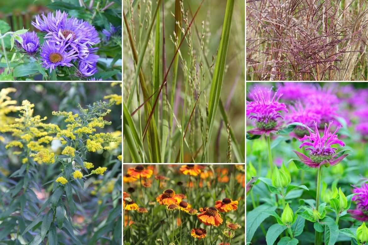 Une idée d’association naturaliste : Aster novae-angliae ‘Purple Dome’ (ou ‘Violetta’ plus haut ou encore un mélange avec ‘Little Carlow’), Solidago (altissima en fond de massif ou ‘Gold King’ ou encore rugosa), Panicum virgatum ‘Shenandoah’, Helenium ‘Sahin’s Early Flowerer’ (et/ou Helenium ‘Rubinzwerg’), Miscanthus sinensis ‘China’, et Monarde ‘Scorpion’… vous pouvez ajouter aussi des Kniphofias, des cannas…
