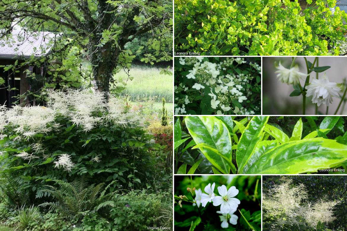 Un exemple d’association en massif au printemps : Sorbus aucuparia, Euphorbia amygdaloïdes var. robbiae, Viburnum plicatum ‘Watanabe’, Aquilegia ‘Green Apples’, Aucuba japonica ‘Sulphurea Marginata’, Geranium nodosum ‘Silverwood’, Aruncus dioïcus.